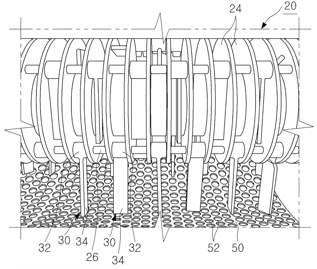 본 타격식 복합 선별기는 선별부, 구동부, 스크린의 3가지 핵심 구성요소로 설계되었습니다. 선별부는 샤프트, 디스크들, 연결축들, 회전편들로 구성되어 투입된 폐기물을 원심력으로 타격하여 이물질과 수분을 효과적으로 분리합니다. 구동부는 각 선별부에 원심력을 제공하며, 스크린은 분리된 이물질과 수분만 자중에 의해 하부로 낙하시킵니다. 회전편의 자유회전 메커니즘과 라운드진 형상의 스크린 설계를 통해 최적의 선별 효율을 달성합니다.