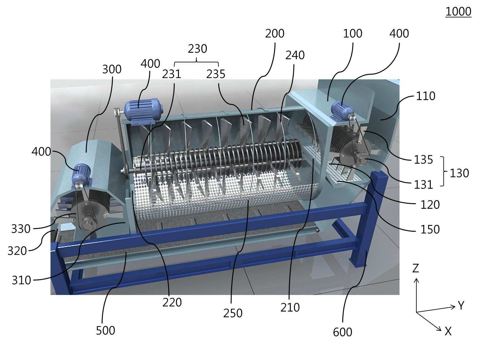 본 선별 장치의 핵심은 경사 회전날개와 평면 회전날개의 조합, 그리고 이송 가이드부의 나선형 구조를 통한 효율적인 폐기물 처리입니다. 특히 제1 파쇄부와 타격선별부의 연계 시스템은 기존 기술의 한계를 극복한 혁신적인 솔루션으로, 선별 효율성과 에너지 절약을 동시에 실현합니다.