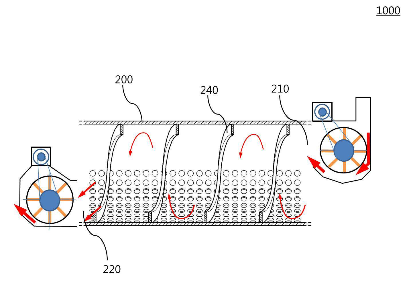 제1 파쇄부에서 투입된 폐기물을 타격 및 파쇄하고, 타격선별부에서 풍력을 발생시켜 수분을 건조시킵니다. 나선형태의 이송 가이드부와 다양한 회전 날개들이 협력하여 효율적인 파쇄 및 이송 작업을 수행하며,